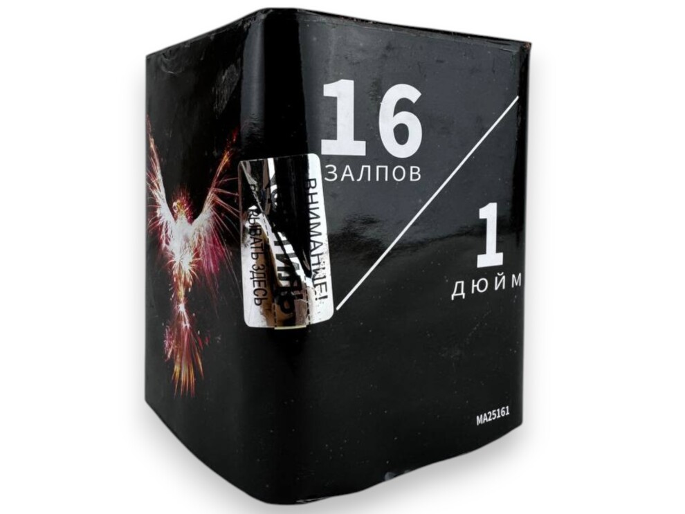 Салют отстреливает 16 зарядов калибра 1,0 дюйм разнообразными красочными эффектами до 45 м высотой за 25 сек.