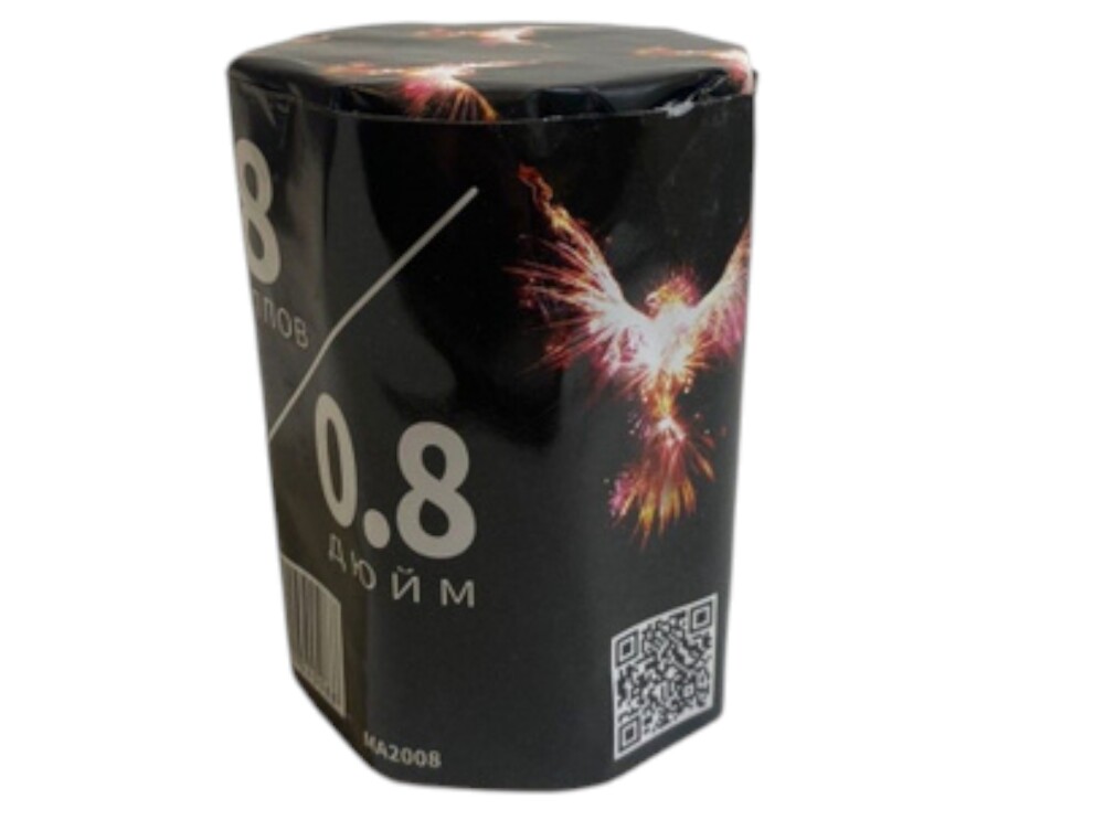 Салют отстреливает 8 зарядов калибра 0,8 дюйм разными эффектами до 40 м высотой за 20 сек.