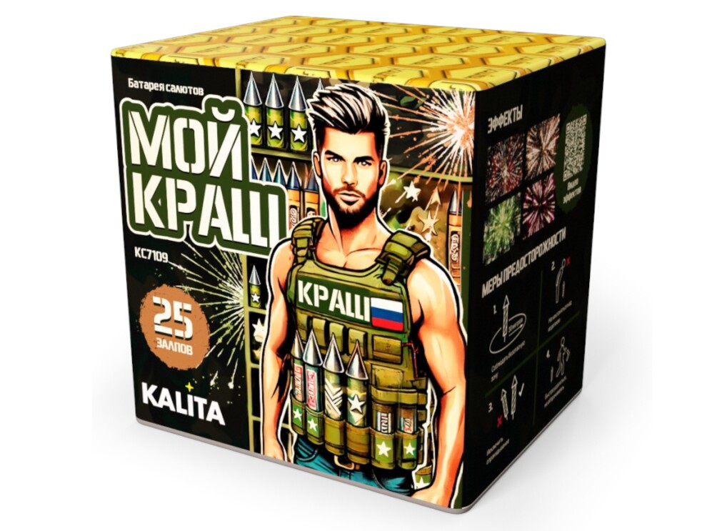 Салют отстреливает 25 зарядов калибра 1 дюйм 4-мя разнообразными очень красочными эффектами до 45 м высотой за 25 сек.