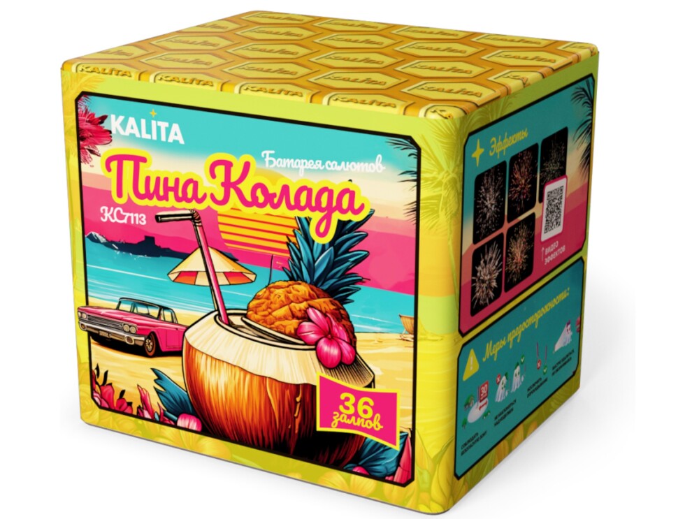 Салют отстреливает 36 зарядов калибра 1,0 дюйм 5-ю разнообразными эффектами на высоту до 40 м за 45 сек.
