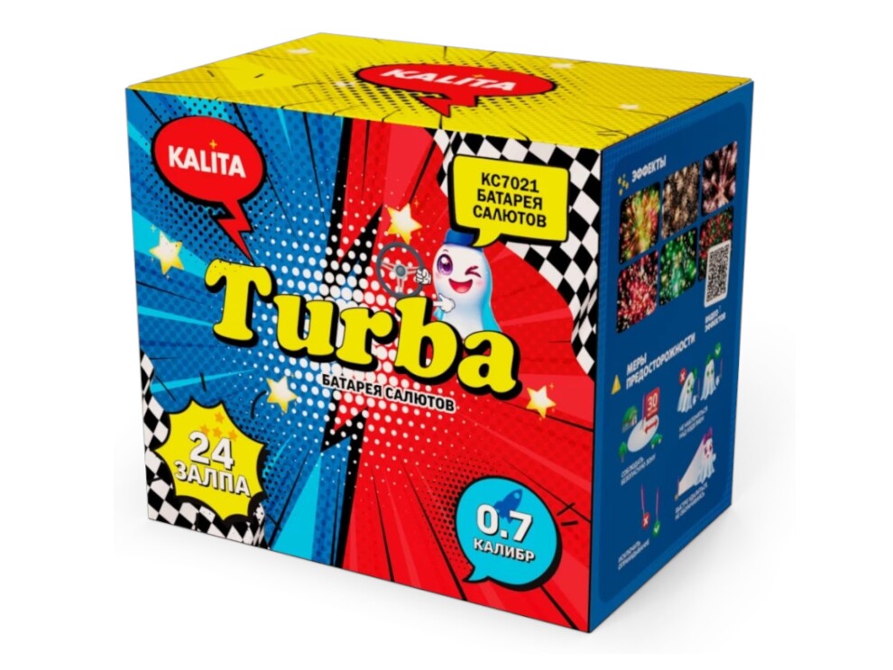 Салют отстреливает 24 зарядов калибра 0,7 дюйм 6-ю разнообразными очень красочными эффектами до 25 м высотой за 30 сек.